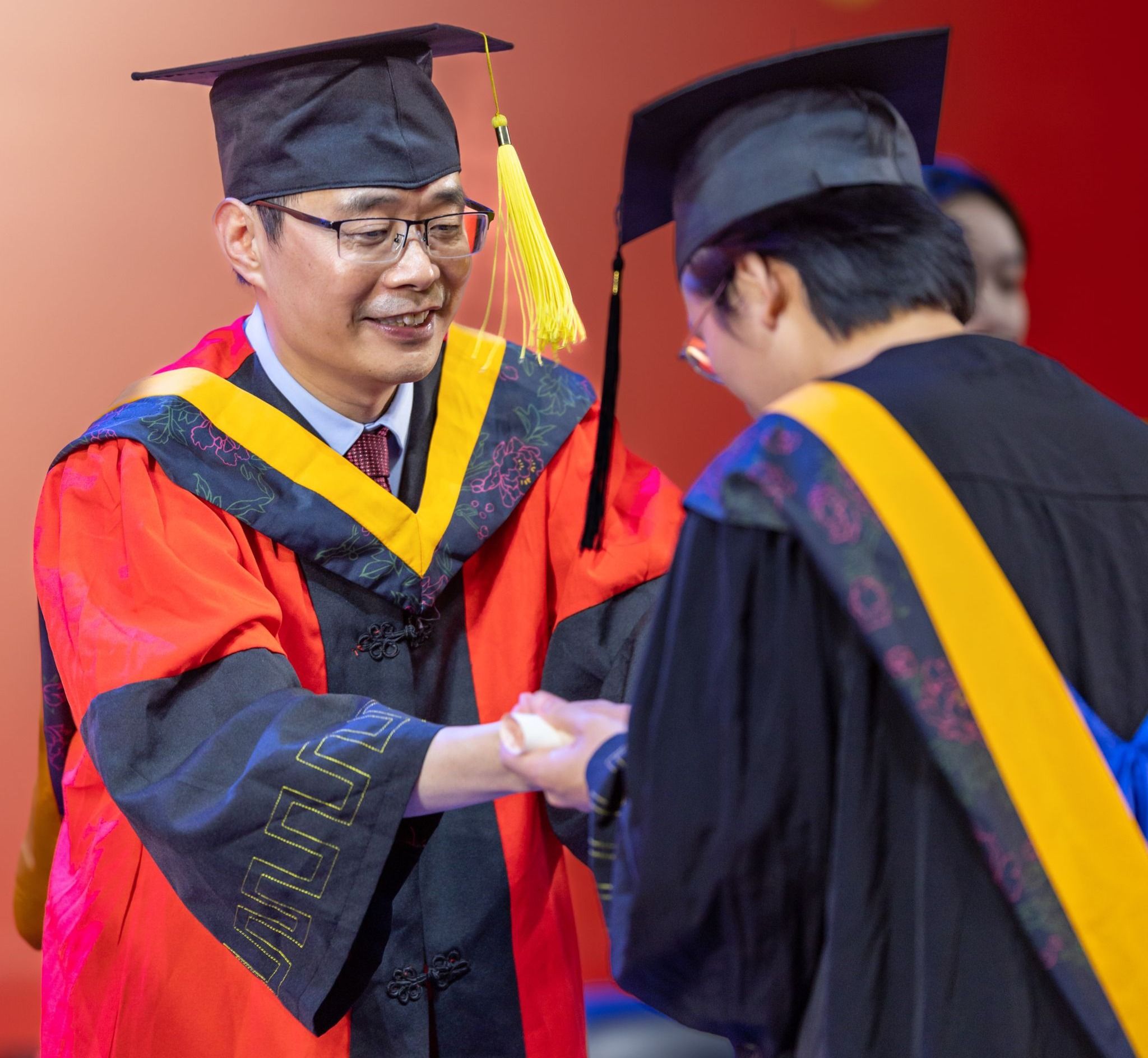 在学士学位授予环节中,副校长庞新厂和学院学位委员会的代表,逐一为学士学位获得者正冠拨苏、颁授学位证书并合影留念。