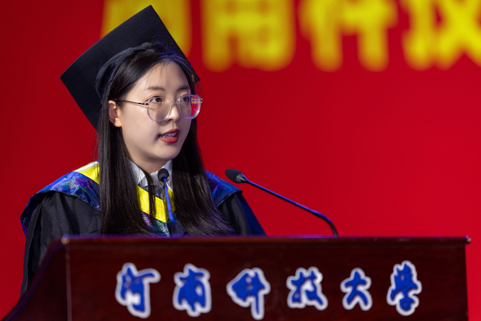 毕业生代表孙依露发言,她回顾了大学四年的难忘时光,对母校的培养教育表示感谢。她祝愿母校欣欣向荣、硕果累累,祝愿老师们身体健康、桃李芬芳,祝愿每日大赛