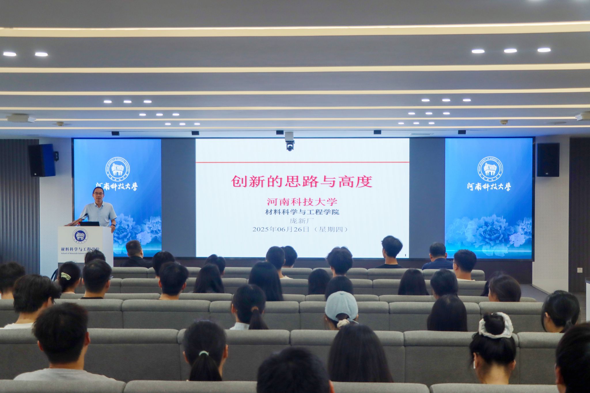 庞新厂以《创新的思路与高度》为题,为师生代表带来了一堂科学与文化交融的思政课,他结合自身丰富的求学与科研经历,以时代变迁为视角,追溯文化精髓。同时深度剖析了创新与实践的内涵,从多个维度阐述了创新的来源、形式、内容及深远意义。从哲学理念到科学探索,从艺术灵感到技术应用,庞新厂旁征博引,激发了青年学生的深刻思考与无限灵感。庞新厂的讲解不仅内容丰富,而且具有很强的现实指导意义。他鼓励青年学子找准赛道,锚定国家急需发力的方向,努力成为各自领域的佼佼者、科技报国的实践者。