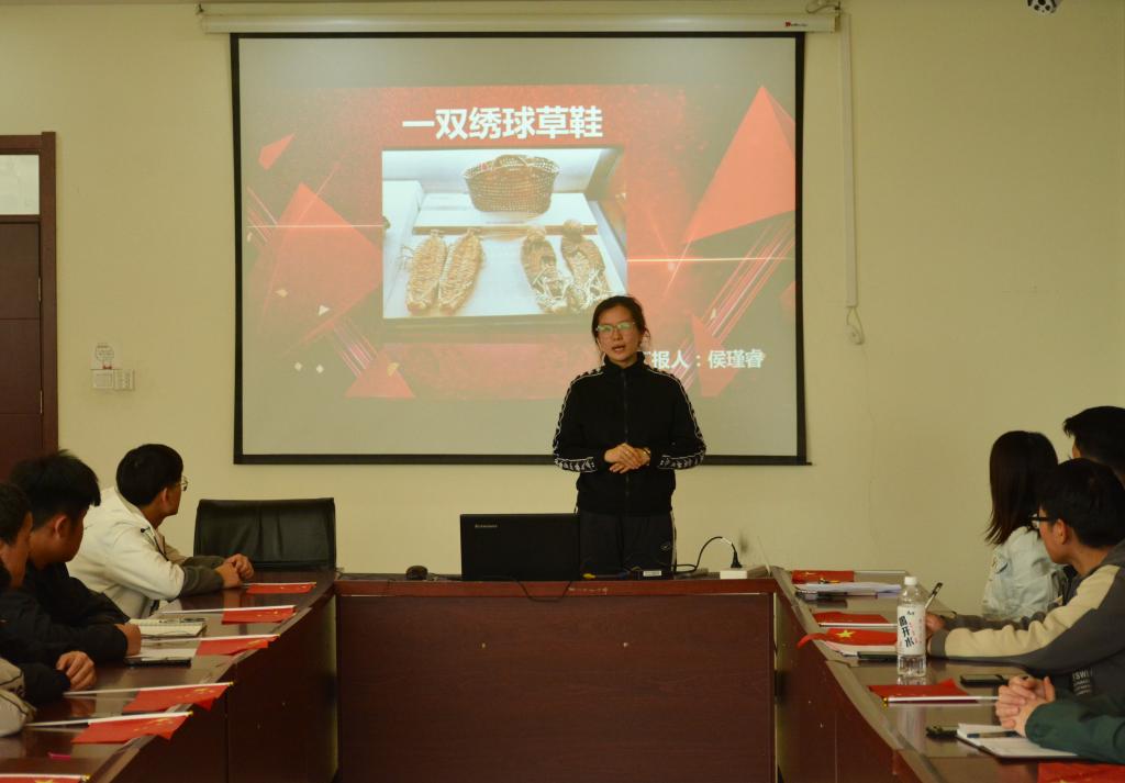 最后,预备党员金材193班的侯瑾睿同学为大家分享了“一双绣球草鞋”故事。她号召同学们在党史这部深厚的教科书中汲取力量,牢记初心、勇担使命,努力学习、奋发有为,不辜负党、国家和人民的期望,争做担当民族复兴大任的时代新人。