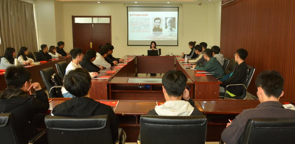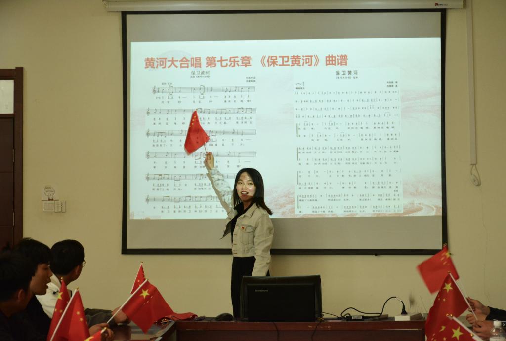 王梦真打破常规、推陈出新,以红色歌曲《黄河大合唱》为切入点,向同学们娓娓道出了歌曲背后的故事,重现了黄河渔夫与滔天巨浪搏斗的场景,展现了革命前辈们保家卫国、敢于奋斗的拼搏精神。紧接着详细讲解了歌唱的发音技巧和演唱方式,带领同学们学唱了《黄河大合唱》中《保卫黄河》篇章。王梦真表示“一首红色歌曲就是一段鲜活的历史,今天我们以红歌的方式致敬革命先烈,在故事中感悟信仰力量,在传唱中激发奋斗热情,真正做到学史明理、学史增信、学史崇德、学史力行。”随后,与会人员一起观看了《黄河大合唱》视频片段,在恢弘壮阔的合唱声中,同学们为歌曲不屈不挠、顽强拼搏的精神所感染,再次挥舞红旗齐唱《黄河大合唱》。