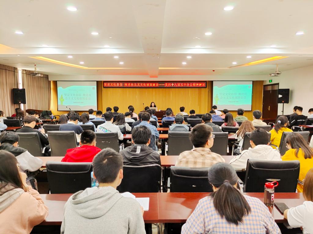 在工科一号楼5059报告厅举办“坚定文化自信 推进社会主义文化强国建设--党的十九届五中全会精神解读”专题讲座。讲座由学院党委书记李怀民主持,马克思主义学院刘晓丽老师主讲。