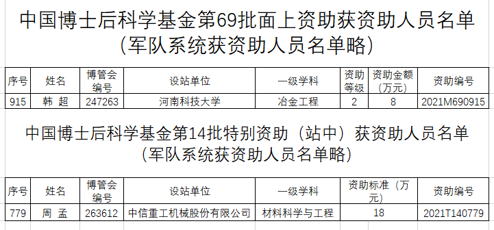 博士后科研流动站韩超博士获得中国博士后科学基金第69批面上资助,和中信重工合作培养的周孟博士获得中国博士后科学基金第14批特别资助(站中)。