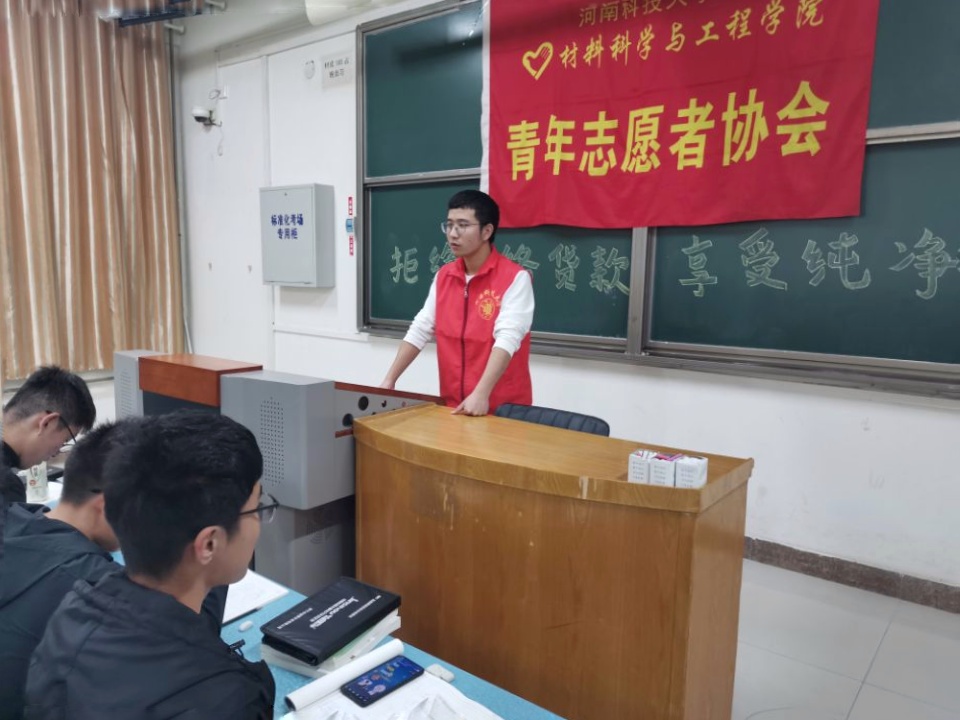 青年志愿者协会于11月12日至13日组织19级各班团支部开展关于“拒绝网络贷款,享受纯净校园”的主题班会。