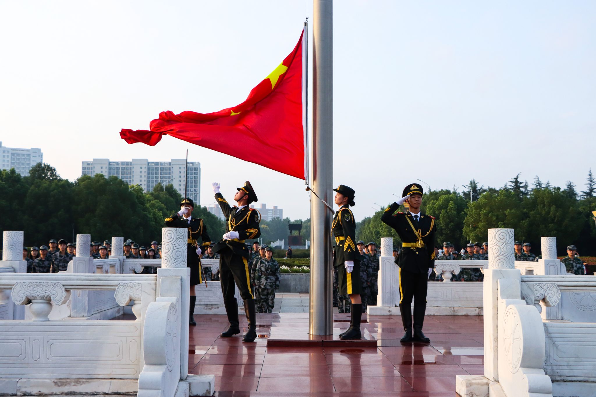 7时整,国旗护卫队迈着铿锵有力的步伐,迎着朝阳,昂首挺胸,护送国旗入场。“升国旗,奏唱国歌!”随着雄壮的《义勇军进行曲》响起,五星红旗冉冉升起。全场肃立,行注目礼。