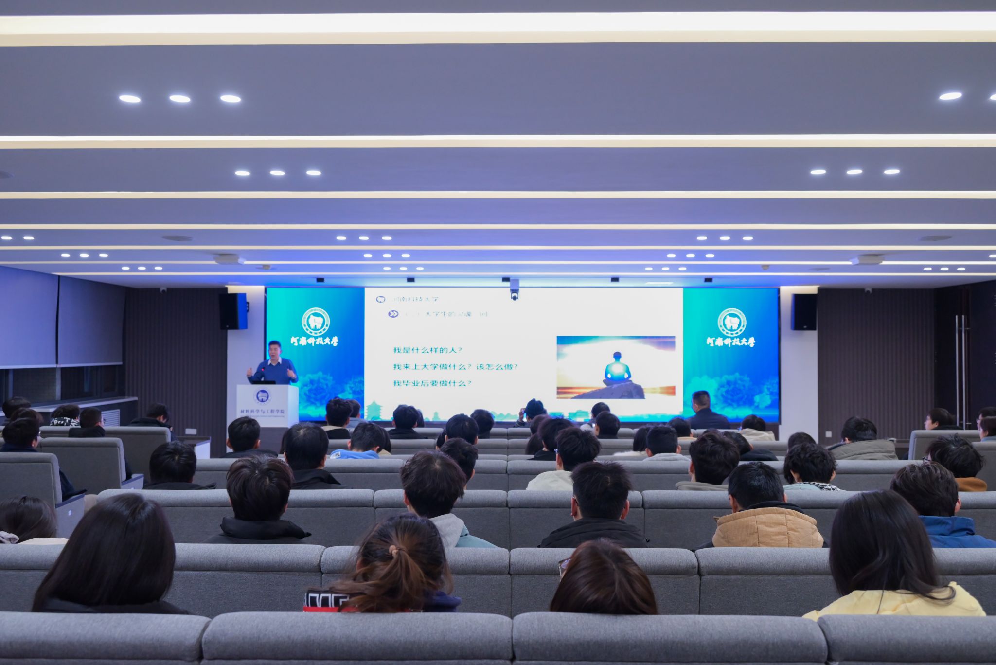 在5059学术报告厅为2023级学生举办职业生涯规划讲座,特邀学校招生就业办公室主任姚纲主讲,讲座由学院党委副书记贾海波主持。