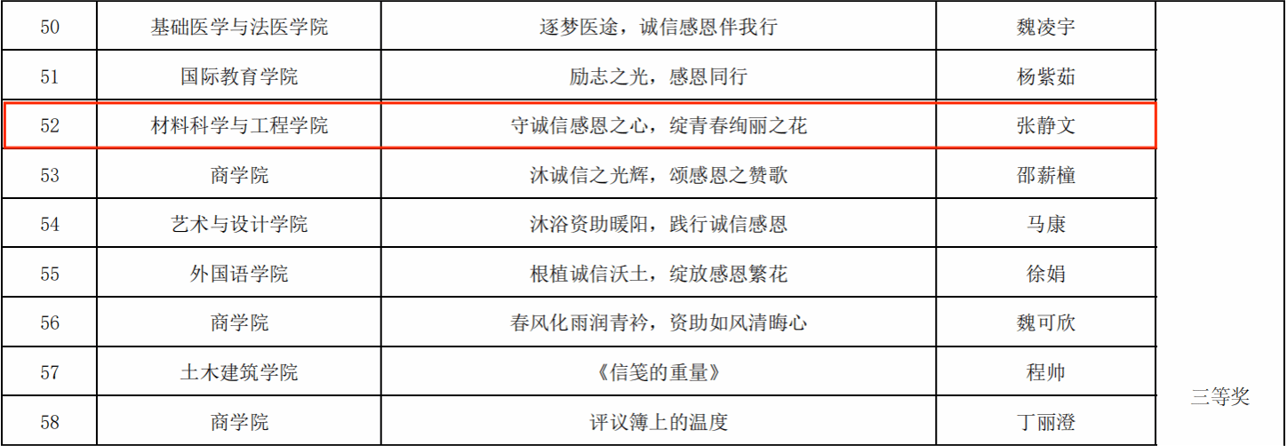 本次活动以“守诚信之本,怀感恩之心”为主题,面向全省高校、中职学校和技工院校,分为研究生、本科、高职、技工院校和中职五个组别展开,吸引了全省广大学生积极参与。学院参赛作品紧扣赛事主旨,将材料学科严谨务实的特质与真挚情感相结合,题材丰富多元、内容真实生动。学子们以自身或身边人的受助经历为蓝本,用细腻笔触讲述国家资助政策带来的成长力量,生动诠释了社会主义核心价值观的内涵。
