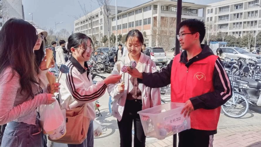 3月8日,为庆祝第113个“三八”国际劳动妇女节,每日大赛 青年志愿者协会在乾园餐厅门口举行“芬芳三月,与爱同行”志愿活动。