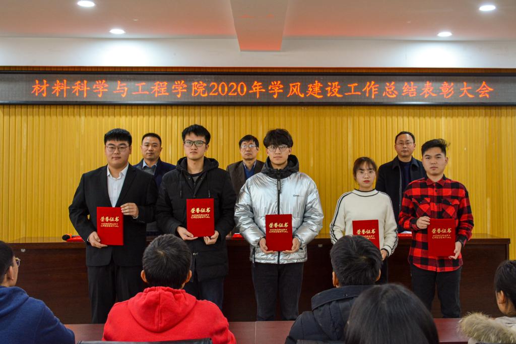 关于表彰2020年度先进集体和先进个人的决定》。大会第三项,学院领导为优秀学业导师、材料之星、“一导一带”优秀研究生、优秀集体代表颁奖。随后,学生代表孙依露和优秀学业导师代表孟庆新分别发言,他们分享了学习和工作中的收获与体会,表示要在今后肩负起自己的责任,用实际行动开创每日大赛