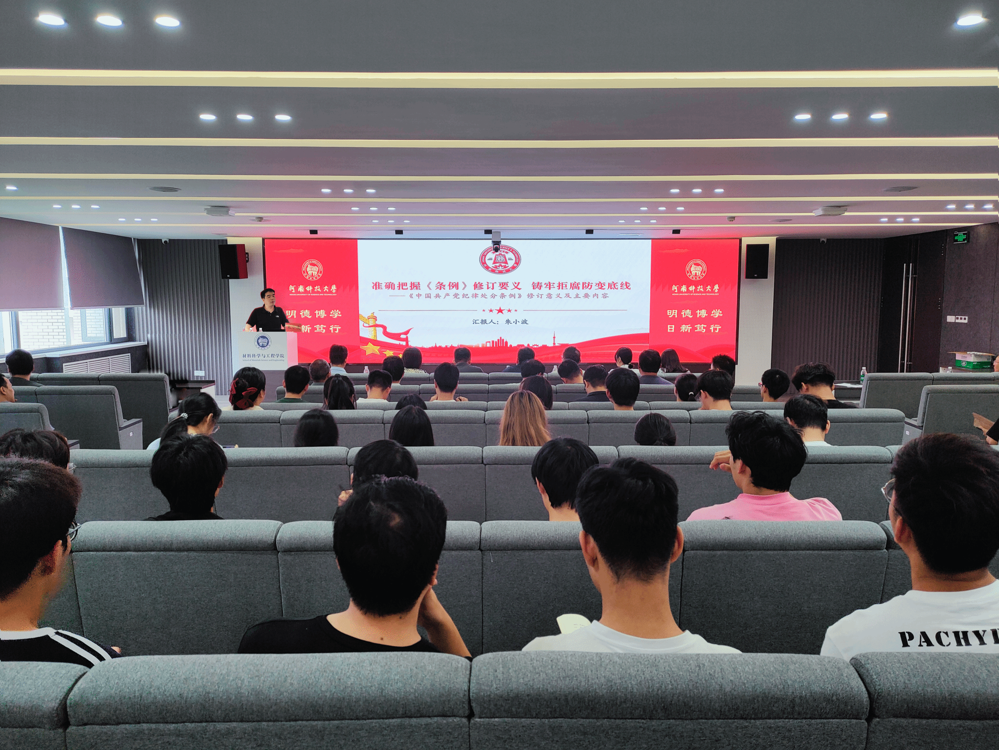 在工科一号楼5059学术报告厅举办党纪学习教育专题讲座,特邀校纪委第三纪检监察室主任朱小波为学院师生党员作“准确把握《条例》修订要义 铸牢拒腐防变底线”的专题报告。