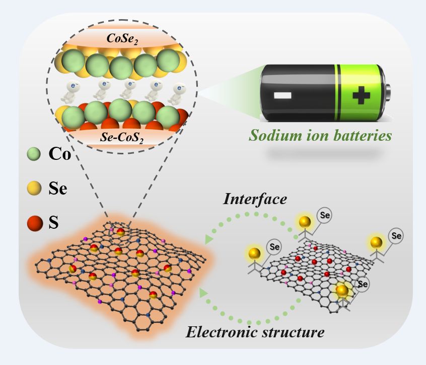 CoS2作为典型的转化型储钠阳极,具有高理论容量、独特的四电子反应机制、多重价态和结构多样性等优势。然而,其低的本征电导率(1.63×10−5 S cm−1)易导致储钠过程中离子/电子传输动力学过程缓慢,倍率性能不足,储钠优势被弱化。目前,已报道研究表明通过导电碳改性、组分调控和结构设计等策略可以在一定程度上弥补CoS2 基材料本征电导率低的问题,但大多数是基于其外部的修饰。该论文报道了一种逐级Se化实现界面与电子结构双向调控的策略,显著提升了CoS2本征电导率,同时构建的同源钴基异质结进一步增强了材料的界面效应和储钠活性。实验结合理论计算结果证实这种特殊异质结构Se-CoS2/CoSe2的形成过程为:一步硫硒化过程中优先形成CoS2组分。随后,Se逐步取代CoS2中的S位点,富Se区以完全取代产物CoSe2为主,缺Se区以不完全取代Se-CoS2为主。得益于这种基于Se-CoS2的电子结构调控和CoS2/CoSe2异质结间的界面调控,优选的复合材料表现出突出的倍率性能和高的储钠容量。该研究为提升低电导率活性材料和新型异质结构的设计提供了思路。