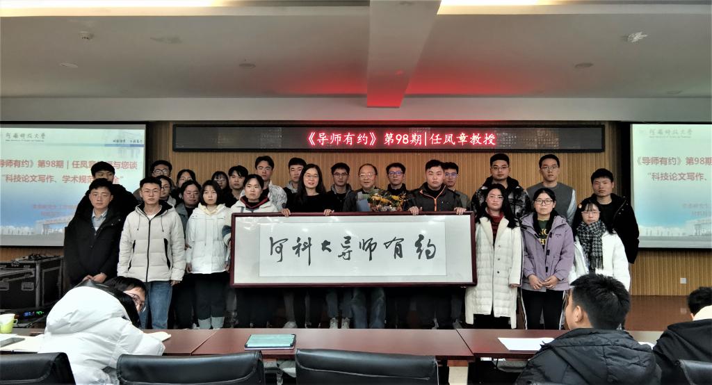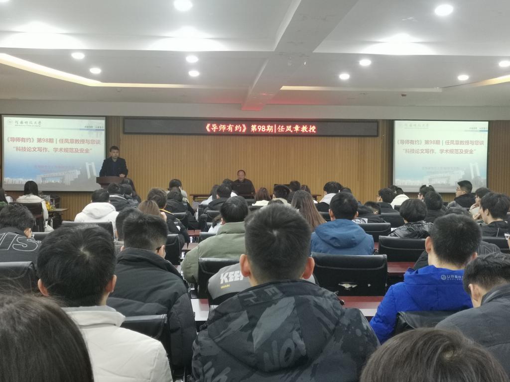 讲座伊始,任凤章教授以幽默风趣的语言告诫同学们要学会二个转变:一是学会从吸收积累旧知识到发掘创造新知识的转变,二是学会从一个被动接受者到一个主动探索者的转变。在专业思想方面,任凤章教授叮嘱各位研究生,在潜心学术研究的同时,要做到爱学校、爱学院和爱专业的协调统一。今日,学子以科大为傲,明日,科大为学子而自豪。诚信是优秀学者的立身之本。任凤章教授结合自身科研经历,给同学们讲解了科技论文写作的要点,并要求同学们严谨治学,不断提高自身的科研素养;同时,通过生动的案例,告诫同学们,学术研究来不得半点虚假,要尊重事实,恪守学术道德,只有立德修身,才能成为一名合格的学者。最后,任凤章教授叮嘱同学们无论是校内还是校外都要注意安全,希望同学们都拥有一个健康的体魄,在科研的道路上披荆斩棘,勇攀高峰。
