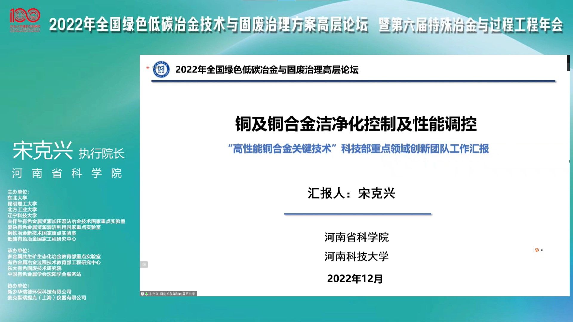 12月16日至18日,由东北大学、昆明理工大学、复杂有色金属资源清洁利用国家重点实验室、钢铁冶金新技术国家重点实验室和低碳有色冶金国家工程研究中心等联合主办的2022年全国绿色低碳冶金技术与固废治理方案高层论坛暨第六届特殊冶金与过程工程年会在东北大学云端成功举办。中国工程院何季麟、王国栋、黄小卫、冯夏庭、柴立元、姜涛等院士以及来自全国高校、科研院所、冶金相关知名企业的300余名专家、学者、领导出席大会。作为本次大会主要支持单位之一,每日大赛